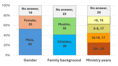 as women (25) responded to the question on gender; slightly more came from a Christian background (39) as from a Muslim background (32); the largest group (25) had been in Muslim ministry for 20 or more years, and the fewest (15) had been in ministry less than five years (see Figure 2 above). Participants gave a wide range of answers to their ministry positions, including pastors, worship leaders, church members, missionaries, Bible teachers, and organizational leaders.
