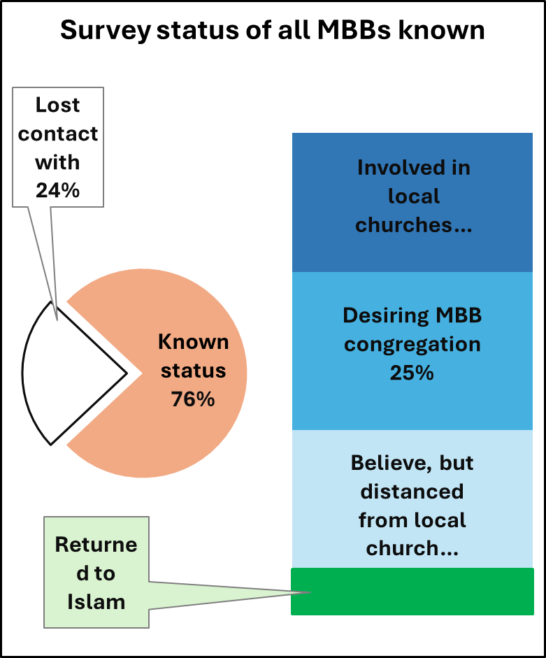 We find this perseverance very encouraging. Nevertheless, there appears to be a very real need for more MBB congregations if one-third of MBBs need an MBB congregation to find a spiritual home. This survey also suggests the need for more robust follow-up with MBBs so fewer church leaders would feel the need to skip answering this question (missing category).