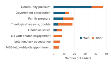 Responses to question four indicated this outcome of MBBs leaving faith in Jesus was rare, so some participants did not answer question six. Among those who answered the question and selected a main reason, the most (35) said it was Community pressure (see Figure 9 below).